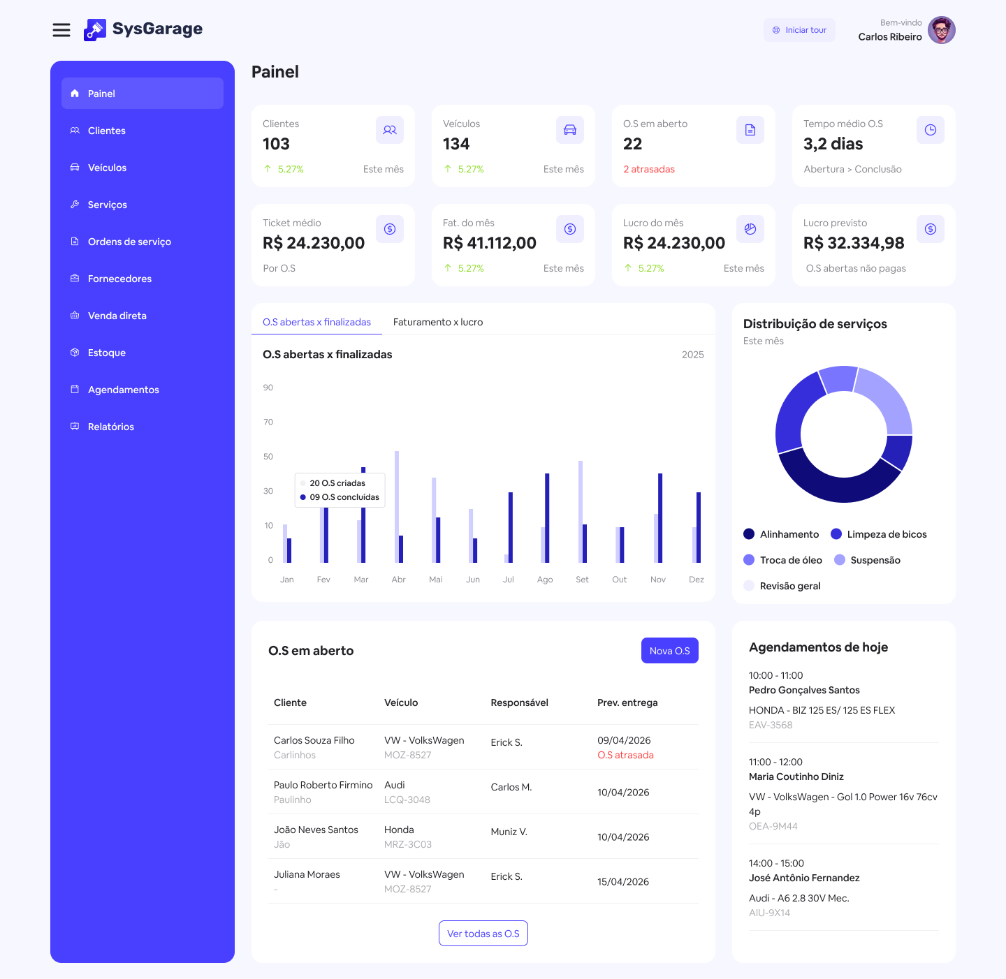 O sistema foi desenvolvido pensando nas necessidades reais das oficinas mecânicas, de funilaria e estética. Conheça as principais funcionalidades