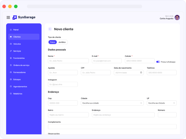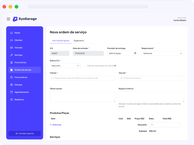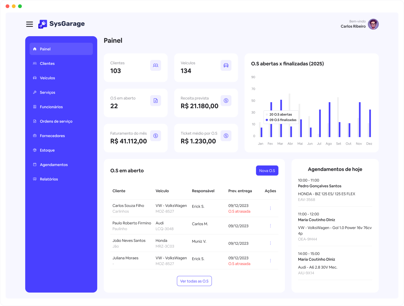 O sistema foi desenvolvido pensando nas necessidades reais das oficinas mecânicas, de funilaria e estética. Conheça as principais funcionalidades