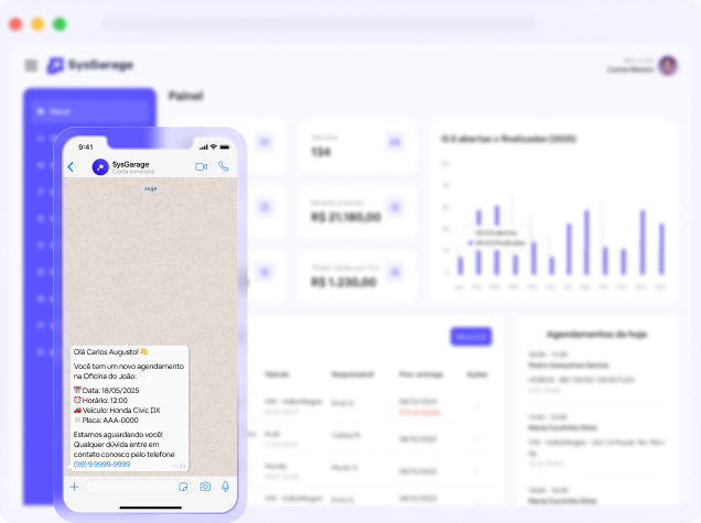 O SysGarage já vem integrado com as principais ferramentas do setor: ao digitar a placa do veículo, o sistema preenche automaticamente os dados com base na consulta FIPE. Notificações automáticas via WhatsApp avisam os clientes sobre agendamentos e ordens de serviço, sem a necessidade de configurações adicionais.