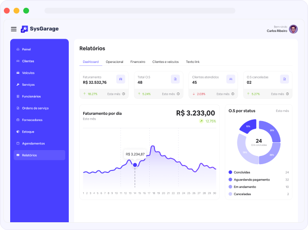 O SysGarage é um sistema online de gestão criado para facilitar o dia a dia das oficinas. Com ele, você organiza ordens de serviço, controla o estoque, agenda atendimentos, gerencia clientes e veículos, tudo em um só lugar — com mais eficiência e menos papelada.
