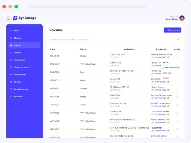 Gerencie os veículos de forma detalhada, com informações como modelo, placa, ano, quilometragem, histórico de serviços e muito mais. Ideal para acompanhar revisões e manutenções com precisão.